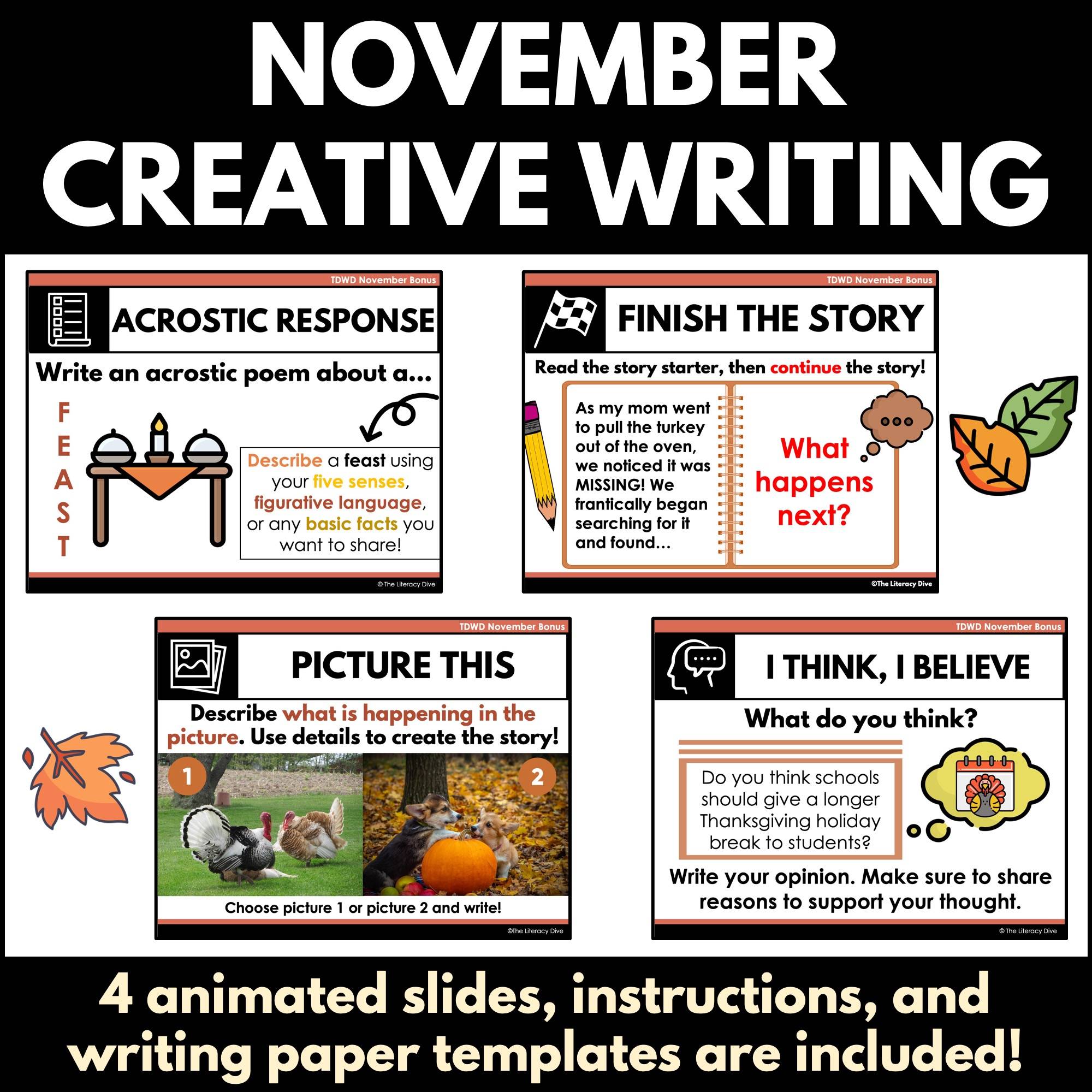 Want try 4 creative writing activities to use during November? Right now, Seasonal bonus activities are only given to The Daily Writing Disguise members, but here is a special set created just for you!